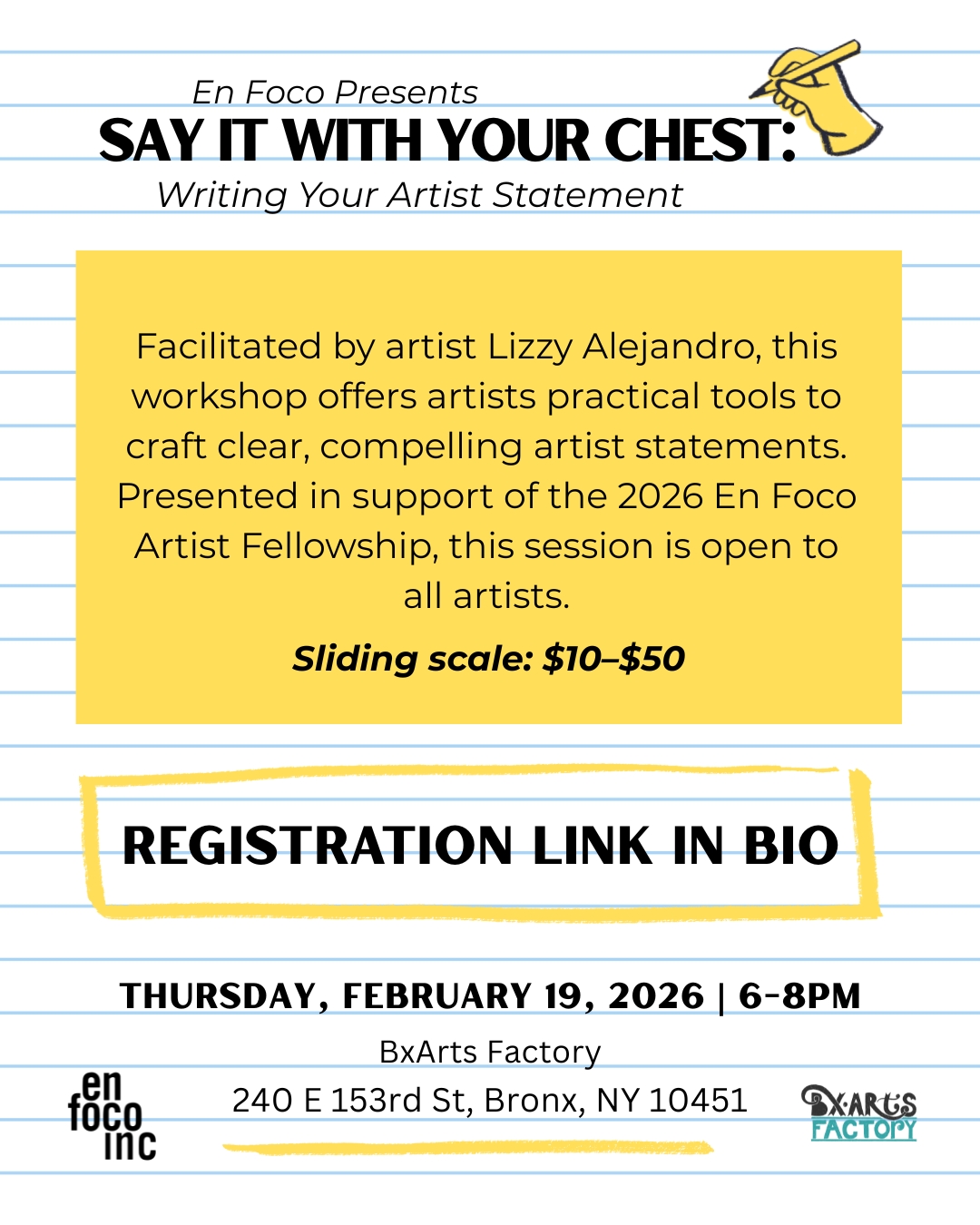 Join En Foco for a special artist statement writing workshop facilitated by artist Lizzy Alejandro. This session is designed to support artists in developing clear, compelling artist statements that reflect the depth, intention, and vision behind their work.